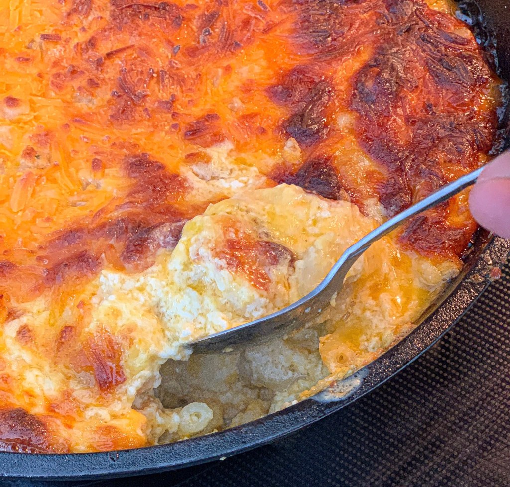 SIDE NOTE: Think of this recipe as a lasagna. All you’re doing is layering. You should have 3 layers of noodles, cheese, and milk mixture by the time you are done. If you are using a regular Cast Iron skillet and not a deep dish, you will only have 2 layers. I suggest reserving 1 cup of the milk mixture if using a regular Cast Iron. This is a recipe you can’t ruin. You can use as much cheese as you want. The only step I recommend following exactly is the milk mixture. If you use less cheese than recommended , you may want to cut down on the amount of milk and cream you use because you don’t want it to come out soupy. But honestly, if you’re not going to use a lot a cheese, don’t bother making this. It is not meant to be healthy, it’s meant to taste good! If you try this recipe, take a picture and tag me! I hope you enjoy!